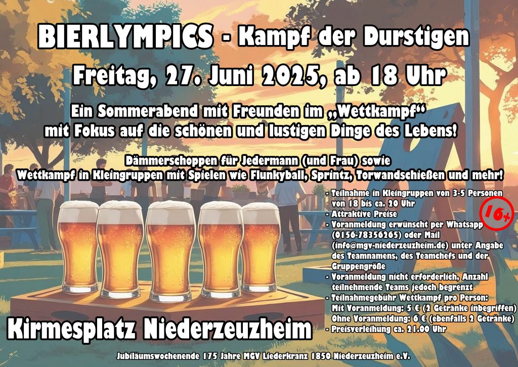 - Am Freitag, dem 27.06.2025 ab 18 Uhr starten wir mit einer „Bier-Olympiade“ auf dem Kirmesplatz.