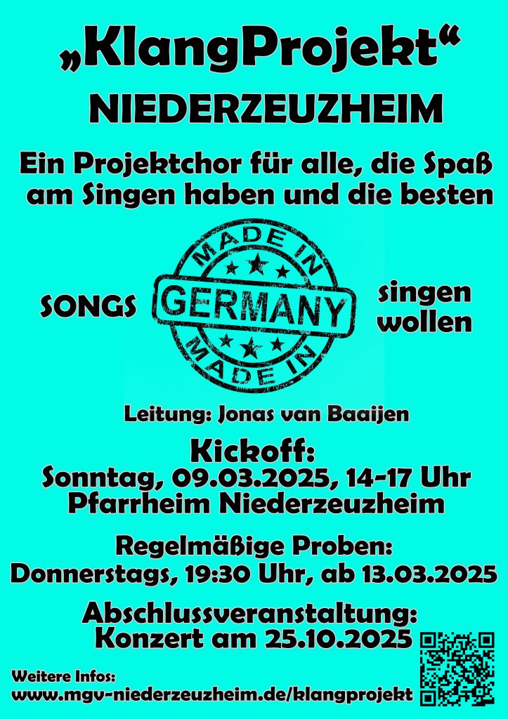 Unter dem Motto „Die besten Songs – Made in Germany“, dem sich der Projektchor widmen wird, werden Lieder von den goldenen 20er Jahren bis in die 90er Jahre des 20. Jahrhunderts geprobt. Diese musikalische Zeitreise soll dann während des Abschlusskonzerts des 175. Jubiläumsjahres des MGV LIEDERKRANZ 1850 NIEDERZEUZHEIM am 25.10.2025 in der Mehrzweckhalle in Niederzeuzheim vorgestellt werden.