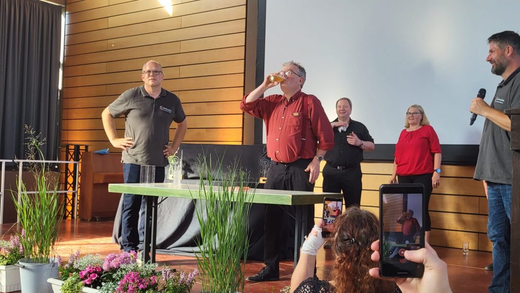 Das Kräftemessen war nach dem Wettbewerb noch nicht beendet. Zwei der nachmittags teilnehmenden Chöre, „Vocale Plaidt e.V.“, Ltg. Janine Schmitt, und „@GC Cäcilia“ Dreikirchen“, Ltg. Wolfgang Tüncher erreichten dieselbe Punktzahl. Da ein Pokal nur einmal vergeben werden kann, entschied man durch ein „Bierwetttrinken“, wer den Pokal mit nach Hause nehmen darf. Der Gewinner „ertrank“ sich nicht nur den Pokal, sondern ebenfalls den frenetischen Beifall der Zuschauer. Zu erwähnen sind noch die zahlreichen jungen Nachwuchssänger, die stellvertretend für ihren Chor stolz ihren ersungenen Preis auf der Bühne entgegennehmen durften.