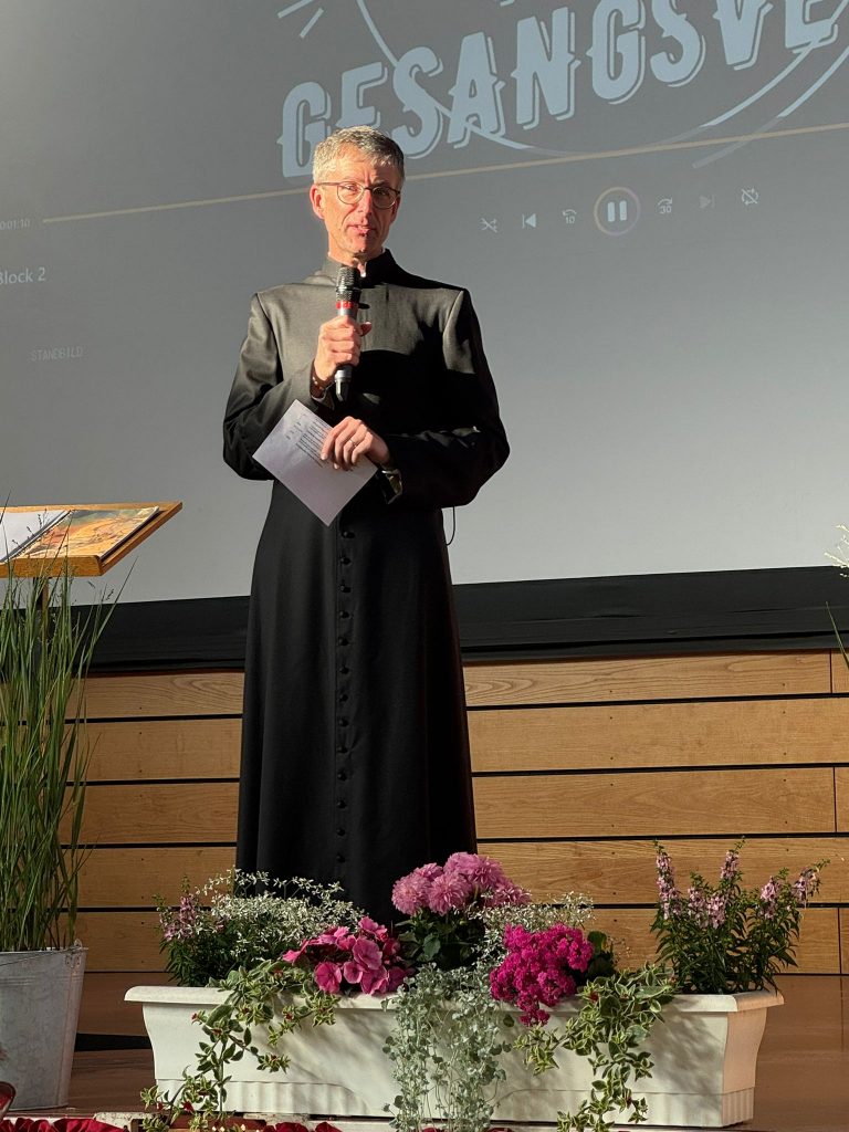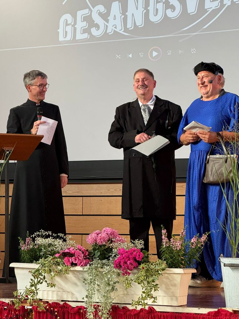 Der Abend startete mit einer sympathischen Eröffnungsrede des 1. Vorsitzenden Matthias Fritz, der mit Unterstützung von Familie und Vereinsmitgliedern über Monate für die Jubiläumsvorbereitungen im Großeinsatz war. Für die Moderation konnte man neben dem stets eloquenten Chorleiter Faßbender den in Niederzeuzheim aufgewachsenen ehemaligen Pfarrer Sascha Jung gewinnen. Gewinnen, im wahrsten Sinn des Wortes. Sascha Jung, Banker, ehemaliger Priester oder auch „Bischofsstörer“